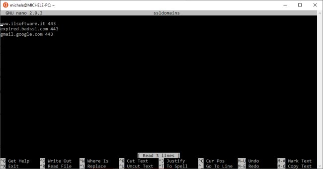 Digitando il comando seguente si creerà un nuovo file di testo chiamato ssldomains che si potrà usare per specificare la lista dei domini oggetto di verifica.