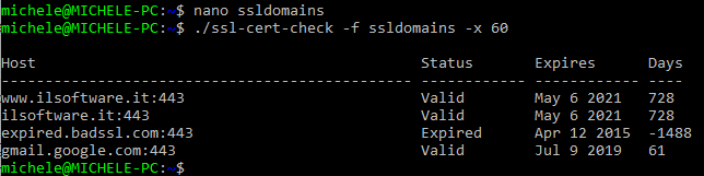 Per controllare la data di scadenza dei certificati digitali usati su decine di siti web è possibile usare un semplice script avviabile dalla finestra del terminale Linux o dalla bash Linux integrabile in Windows con WSL: Eseguire programmi Linux su Windows, anche con interfaccia grafica.