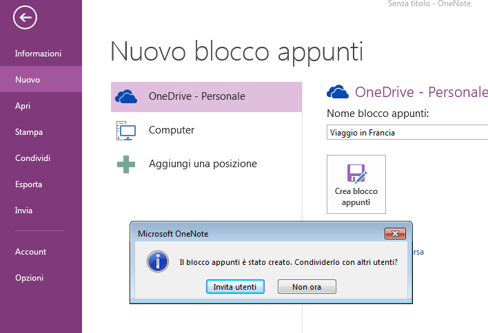Le note possono essere condivise anche con chi non dispone di OneNote. Basta infatti creare, ad esempio, un nuovo blocco appunti cliccando su File, Nuovo e selezionare l’icona Crea blocco appunti.