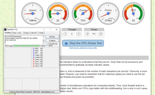 Aumentando il numero di thread concorrenti e la potenza quindi cliccando su Start CPU stress test vedrete che la velocità di rotazione delle ventole e le temperature cominceranno ad aumentare.