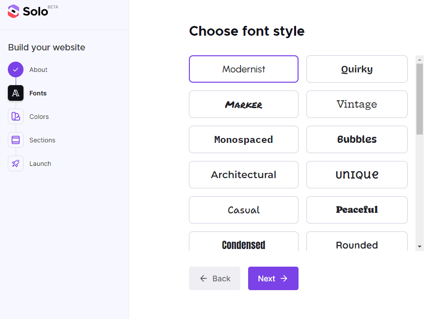 Per iniziare, basta collegarsi con la home page di Solo quindi fare clic sul pulsante Build your website. I passaggi successivi, permettono di selezionare le fonti di carattere, le combinazioni di colori e definire le sezioni del sito che s’intende creare.
