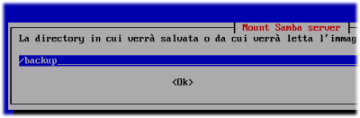 Nella finestra successiva, nel nostro caso, sarà necessario premere il tasto Invio dopo aver indicato l’opzione samba_server Uso il server SAMBA (server di rete). Si tratta della scelta corretta quando si desidera memorizzare il file d’immagine prodotto da Clonezilla su un sistema, collegato in rete locale, sul quale è in esecuzione Windows. Il file d’immagine verrà salvato nella cartella precedentemente condivisa.