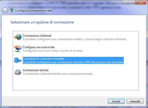 Si dovrà poi fare clic sul link Configura nuova connessione o rete quindi selezionare l’opzione Connessione a una rete aziendale: