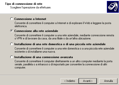 In Windows XP la procedura è molto simile. Basta accedere al Pannello di controllo del sistema operativo, cliccare su Connessioni di rete quindi sulla voce Crea una nuova connessione. Alla comparsa della schermata Creazione guidata nuova connessione, va scelta l’opzione Connessione alla rete aziendale:
