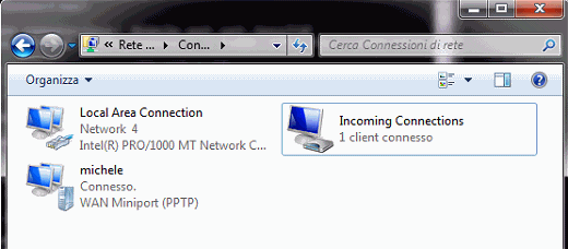 Dopo aver cliccato su Chiudi, nella finestra delle connessioni di rete di Windows 7, si troverà la nuova voce Incoming connections che verrà aggiornata riportando i client di volta in volta connessi alla rete VPN.