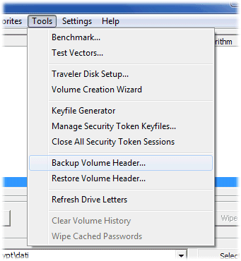 Il backup è invece effettuabile accertandosi prima di aver “montato” l’unità d’interesse (Select file o Select device) quindi ricorrendo al menù Tools, Backup volume header di TrueCrypt.