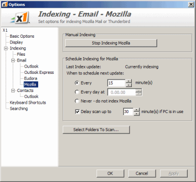 X1 punta molto sull’efficacia del programma, sulla sua efficienza e sulla semplicità d’uso. Le regolazioni possibili (accessibili cliccando sul menù Tools, Options), messe a disposizione, sono quelle strettamente necessarie: si può indicare la locazione ove debbono essere memorizzati gli indici del programma, le tempistiche per l’aggiornamento degli stessi, impostare alcune "scorciatoie" che sveltiscano ulteriormente l’uso di X1.