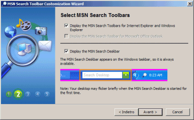 Microsoft non poteva esimersi dal proporre una soluzione di “desktop searching” proprietaria. Ecco quindi che, dopo una fase di beta testing iniziale, è stato lanciato MSN Desktop Search, divenuto parte integrante di MSN Search Toolbar, barra aggiuntiva per Internet Explorer che migliora le capacità di ricerca del browser in Rete e sul personal computer locale.