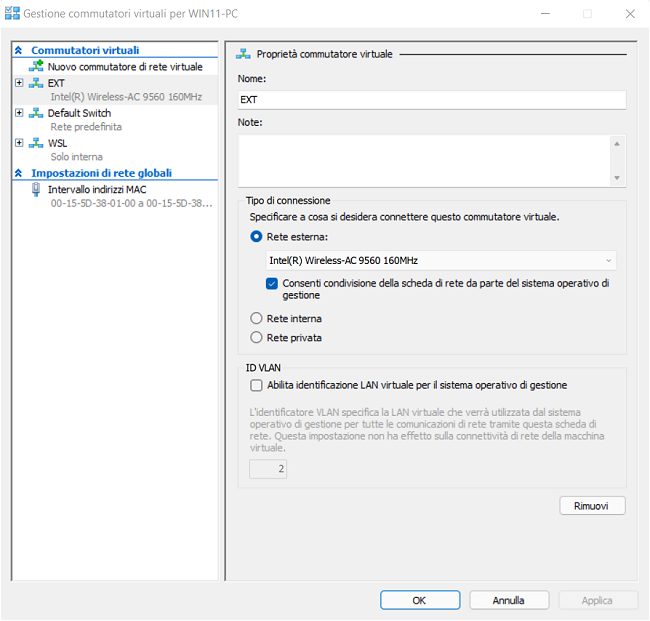 Nel caso di Hyper-V, invece, la personalizzazione delle schede di rete virtuali utilizzate dalle virtual machine è completamente in capo all’utente: assegnando un commutatore virtuale (virtual switch) alla macchina virtuale Hyper-V impostato su Rete esterna, è possibile fare in modo che il sistema virtualizzato appaia come un normale sistema fisico collegato alla rete locale (riceverà un IP privato dal router).