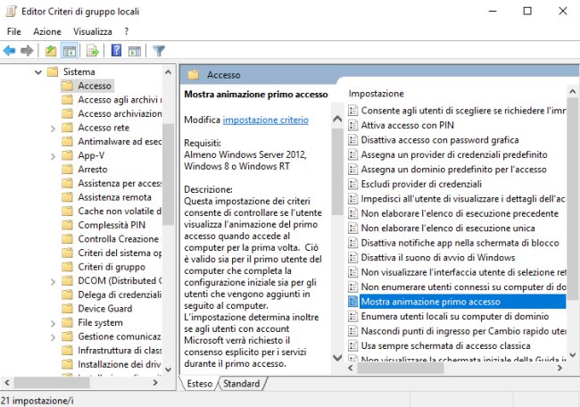 Per ripristinare il comportamento abituale, basta impostare su Non configurata la regola Mostra animazione primo accesso oppure impostare a 1 il valore HKEY_LOCAL_MACHINE\SOFTWARE\Microsoft\Windows\CurrentVersion\Policies\System\EnableFirstLogonAnimation utilizzando l’Editor del registro di sistema (Windows+R, regedit).