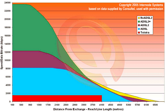 Una ADSL che usa il vecchio standard ITU G.992.1 (area di colore azzurro) evidenzia un egual comportamento sino a poco più di 2 chilometri di distanza dalla centrale. A distanze maggiori, le performance decadono sino ad azzerarsi all’incirca a 5,3 km).