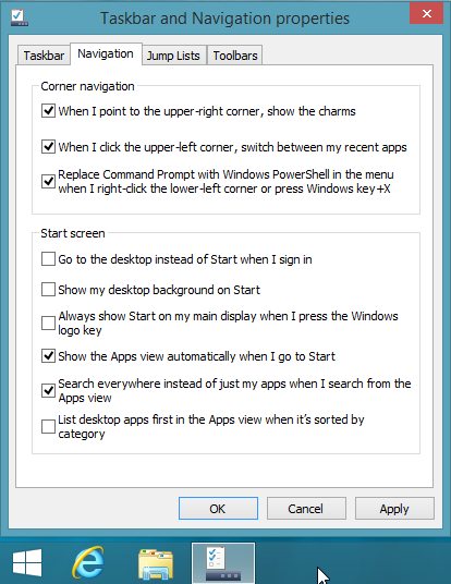 Facendo clic con il tasto destro del mouse sulla barra delle applicazioni, scegliendo Properties, la scheda Navigation, quindi spuntando la casella Show the Apps view automatically when I go to Start, si può fare in modo la pressione del pulsante Start provochi la comparsa della lista delle applicazioni installate in Windows 8.1 piuttosto che la pagina principale dell’interfaccia “a piastrelle”: