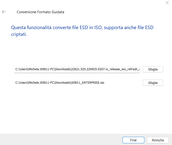 Con un clic su Fine, inizia il processo di conversione che richiede diversi minuti di tempo. Concluso questo passaggio, si può eventualmente rimuovere il file ESD e conservare il file con estensione ISO utilizzandolo ad esempio per creare un supporto avviabile con Rufus oppure per configurare una macchina virtuale Hyper-V.