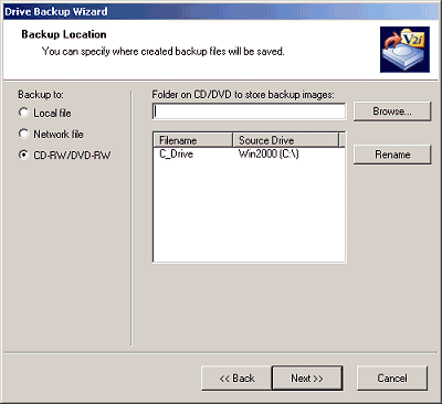 Drive Image 7 consente, infine, di salvare i propri file d’immagine su qualsiasi tipo di periferica comprese unità USB e FireWire. Il programma supporta anche un buon numero di masterizzatori DVD offrendo la possibilità di memorizzare le immagini direttamente su tali supporti. E’ sempre possibile memorizzare i file d’immagine anche su CD-R, CD-R/W ed unità rimovibili (i.e. Zip/Jaz).