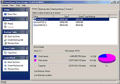Durante i nostri test, abbiamo verificato come Drive Image 7 sia in grado di creare e ripristinare senza problemi immagini di partizioni e dischi fissi senza abbandonare l’ambiente Windows. Il software di PowerQuest è stato in grado di creare senza difficoltà un file d’immagine della partizione Windows XP sulla quale stavamo operando evitando il riavvio del personal computer (assolutamente obbligatorio sino alla versione 2002 di DriveImage…).