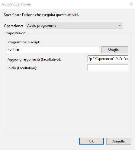 Per richiamare direttamente l’utilità, basta digitare ForFiles nella casella Programma o script quindi indicare tutto ciò che segue nella casella Argomento.