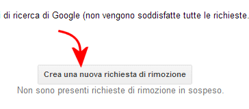 A questo punto, per accelerare il processo di rimozione della pagina web dagli indici di Google, è possibile visitare questa pagina quindi fare clic sul pulsante Crea una nuova richiesta di rimozione.