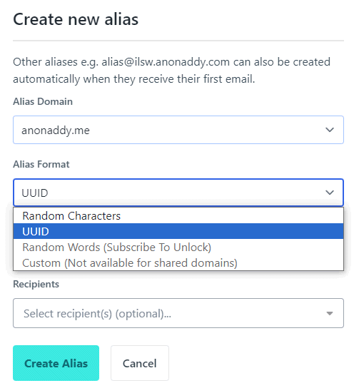 L’email contiene anche un link da cliccare se si volesse disattivare l’alias ed evitare così la ricezione di ulteriori messaggi di posta. La gestione degli alias è in ogni caso effettuabile dalla pagina Aliases di Addy.io. Da qui, cliccando sul pulsante Create alias in alto a destra, si possono anche generare email usa e getta che hanno come nome una serie di caratteri casuali oppure un UUID, un lungo identificativo alfanumerico.