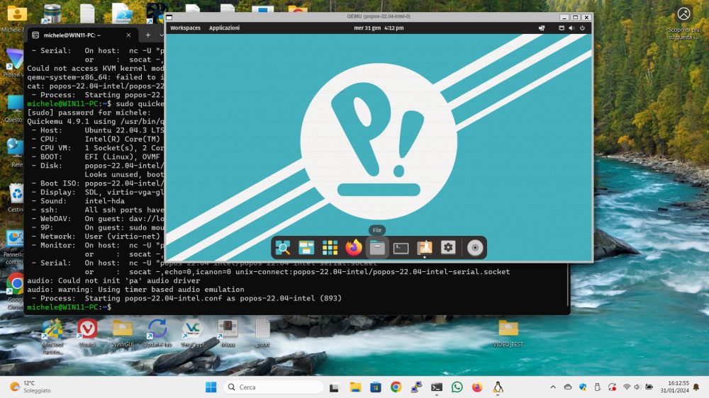 Nell’immagine in figura, si vede un’istanza di Pop!_OS in esecuzione in una macchina virtuale QEMU, creata in pochi minuti con Quickemu su un sistema host Windows 11.