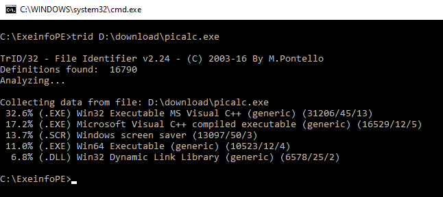 Come si vede, nell’esempio in figura, TrID indica che il file eseguibile risulta precedentemente compilato con Microsoft Visual C++.