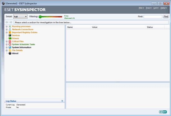 SysInspector suddivide processi in esecuzione, connessioni di rete, elementi del registro di sistema più importanti, servizi, driver, file ad elevata criticità ed operazioni pianificate evidenziando con una differente colorazione gli elementi che dovrebbero destare maggior sospetto.