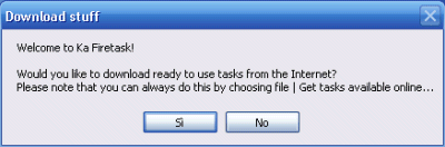 Al primo avvio, Firetask richiede se si è interessati a prelevare, dal sito web degli sviluppatori, una raccolta di operazioni pianificate (“tasks”) già pronte per l’uso. Se si sceglie di rispondere No, tali esempi potranno essere comunque scaricati in un secondo tempo facendo riferimento all’opzione Get tasks available online del menù File. Come spiega la guida visualizzata cliccano sul pulsante Sì, per prelevare dei task già preparati dagli autori del software, è sufficiente visitare questo forum quindi trascinare l’operazione pianificata prescelta nella finestra dei task di Firetask. Al momento va osservato come le operazioni pianificate “già predisposte”, proposte attraverso il sito web del produttore siano ancora poche.