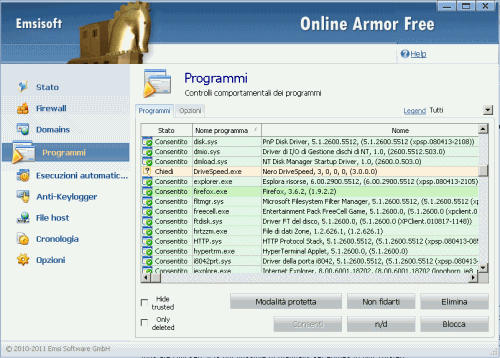 La sezione Programmi consente invece di accedere alle funzionalità HIPS di Online Armor Free. Quando viene eseguita un’applicazione, Online Armor Free proverà, innanzi tutto, a decidere automaticamente quale sia la migliore azione da compiere basandosi sulle informazioni raccolte nell’archivio OASIS ovvero controllando se il programma fosse già classificato come fidato, non fidato o sconosciuto.