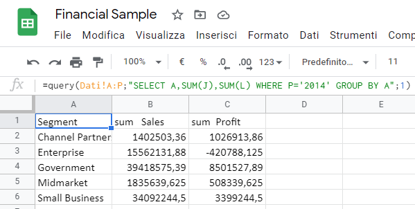 Come si può notare, usando una sintassi SQL-like, questa volta abbiamo chiesto a Google Fogli di usare le funzioni di aggregazione “somma” (SUM()) per sommare vendite (colonna J) e profitti (L).