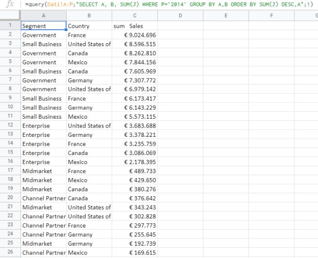 Come si vede, la clausola ORDER BY ordina la somma dei valori di vendita in maniera tale da mostrarli in ordine decrescente e il raggruppamento viene effettuato per le colonne A e B (GROUP BY A,B) ovvero segmento e Paese.