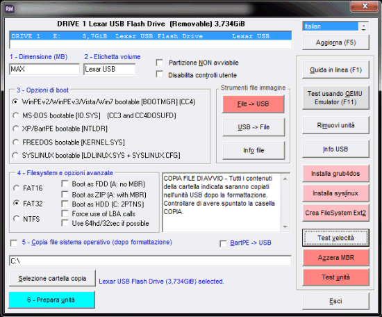 Cliccando su Prepara unità, la chiavetta USB indicata sarà resa avviabile e sarà configurata per effettuare il boot del sistema operativo scelto.