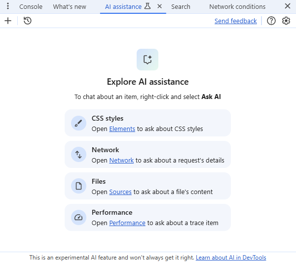 Se la scheda AI assitance non apparisse nel riquadro della Console, cliccate sui tre puntini, su More tools e infine su AI assistance.