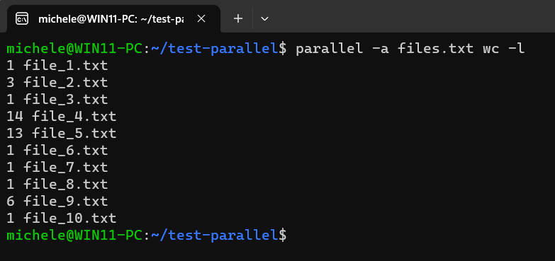 Nell’immagine, si vede che GNU Parallel ha esaminato ciascun file e riportato il numero di righe corrispondenti.