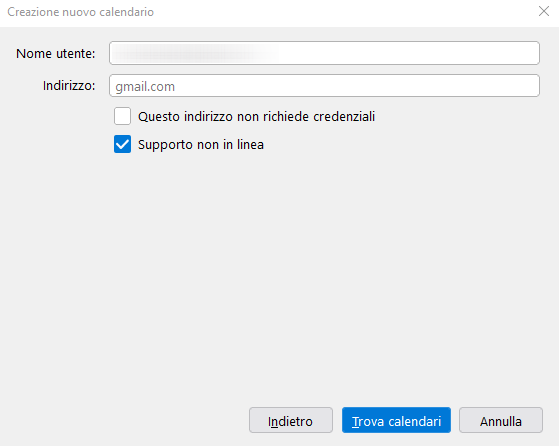 Digitando l’indirizzo dell’account Google nella casella Nome utente e cliccando su Successivo Thunderbird presenta una procedura per attivare la sincronizzazione del calendario.