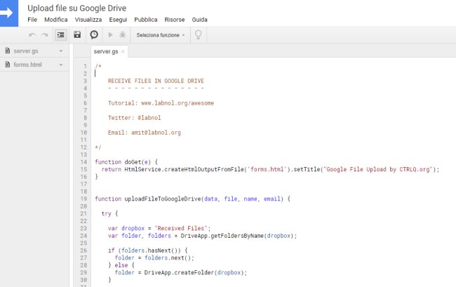 Cliccando sulla scheda forms.html, si troverà il codice HTML predisposto dall’autore dello script per mostrare e gestire il form per l’upload dei file. Per impostazione predefinita viene chiesto all’utente di inserire un nome, un indirizzo email quindi di selezionare dal proprio dispositivo il materiale da caricare.
