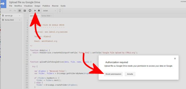Google farà presente che lo script appena creato chiede di “Visualizzare, modificare, creare ed eliminare tutti i tuoi file di Google Drive“: basterà cliccare su Consenti.