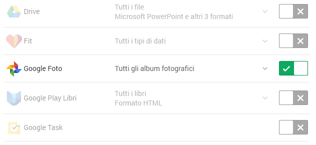 Si dovrà quindi fare clic su Deseleziona tutto quindi attivare solo l'”interruttore” corrispondente a Google Foto.