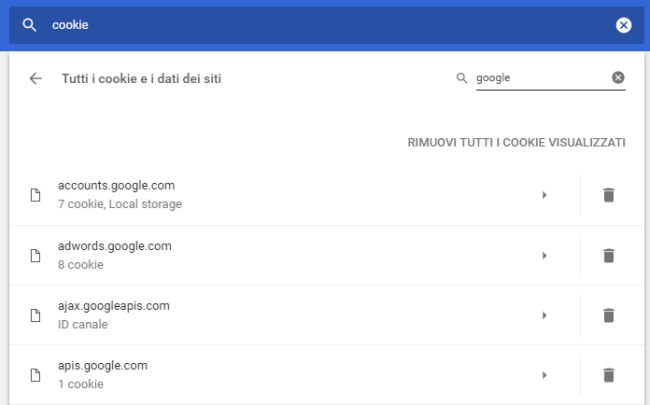 Da Chrome basta accedere alle impostazioni del browser (si può digitare chrome://settings nella barra degli indirizzi), digitare cookie nella casella Cerca nelle impostazioni quindi fare clic su Impostazioni contenuti, su Cookie e infine su Mostra tutti i cookie e i dati dei siti.