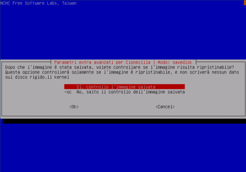 Infine, è necessario specificare l’unità disco o la partizione sorgente il cui contenuto verrà salvato, in rete locale, sotto forma di file d’immagine. Da ultimo, va specificato se Clonezilla debba – per maggior sicurezza – effettuare un controllo finale sul contenuto del file d’immagine generato in modo tale da assicurarsi che sia perfettamente leggibile.