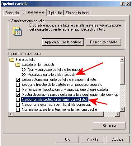 Per eliminare la console di ripristino di Windows XP rimuovendo anche la voce corrispondente dal menù di avvio presentato al boot del personal computer, si dovrà accedere alla finestra Risorse del computer, cliccare sul menù Strumenti, Opzioni cartella quindi sulla scheda Visualizzazione. Qui si dovrà selezionare l’opzione Visualizza cartelle e file nascosti e togliere il segno di spunta dalla casella Nascondi i file protetti di sistema rispondendo Sì alla comparsa della successiva finestra di dialogo.