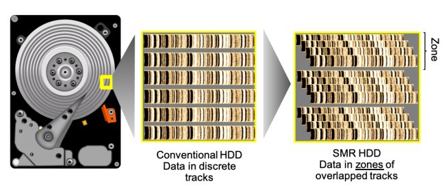 La tecnologia SMR, presentata nel 2013, ha permesso di aumentare il numero di bit registrabili in una specifica area del supporto magnetico. Essa prevede che le tracce sui piatti dell’hard disk possano essere parzialmente sovrapposte a quelle vicine senza introdurre alcuna corruzione dei dati, facendo leva su una struttura che ricorda le tegole di un tetto. “Accavallando” le tracce è possibile arrivare a conservare, nello stesso spazio, un quantitativo di dati maggiore: tra il 25% e il 100% in più.