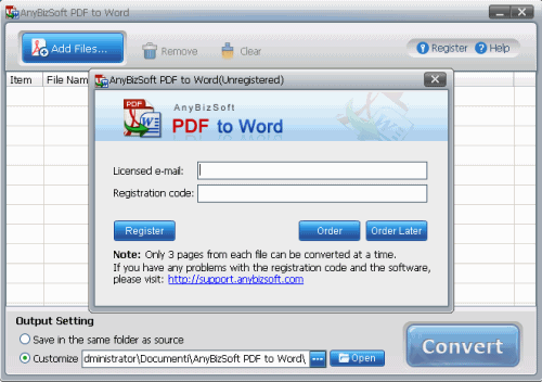 AnyBizSoft PDF to Word non è utilizzabile per scopi commerciali (in questo caso, si dovrà acquistare una regolare licenza d’uso dietro il versamento di una quota di registrazione pari a poco meno di 30 dollari per un singolo sistema) e, per ottenere il proprio codice di registrazione, si dovrà seguire una procedura un tantino laboriosa.
