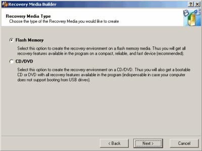 Il comando Recovery media builder offre la possibilità di preparare un supporto di avvio da utilizzare nel caso in cui il sistema in uso non dovesse malauguratamente più avviarsi. Il supporto generato contiene i driver per il corretto funzionamento della scheda di rete: in questo modo, ad esempio, si potrà ripristinare un file d’immagine memorizzato in precedenza su un’unità di rete condivisa. E’ possibile optare per la creazione di un CD/DVD di boot oppure di un’unità USB avviabile. Il supporto di avvio generabile con Backup & Recovery integra anche il supporto per dispositivi di memorizzazione USB e per unità Firewire.