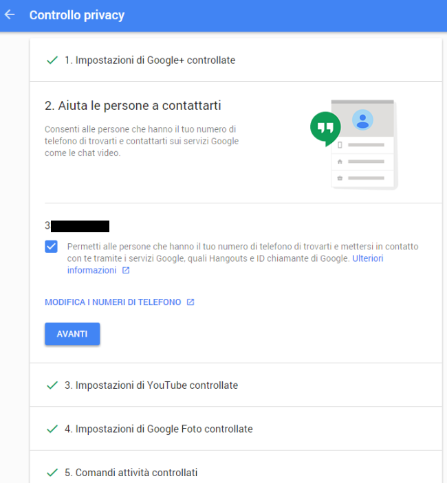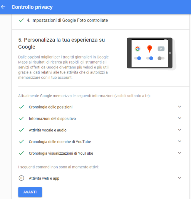 Anche in questo caso, cliccando su Inizia in corrispondenza del riquadro Controllo privacy, si accederà ad una procedura guidata che consente di verificare quali dati personali Google memorizza sui suoi server.