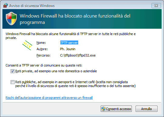 Per avviare TFTP32, basterà fare doppio clic sull’eseguibile tftp32.exe. Una finestra d’avviso, esposta dal firewall di Windows, indicherà che TFTP32 sta cercando di attivare funzionalità server. Per procedere, basterà lasciare spuntata la sola casella Reti private, ad esempio una rete domestica o aziendale e fare clic su Consenti accesso.