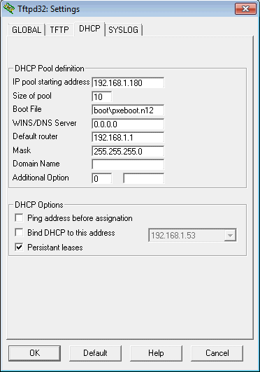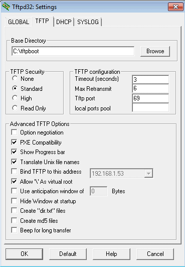 Qui, in particolare, si è modificato la Base directory indicando il percorso assoluto in cui è stato memorizzato TFTP32 quindi si è spuntata la casella PXE Compatibility.