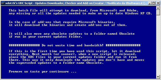 Cliccando due volte sul file UDC-XX.XX.XX.bat, si può eseguire lo script che si farà carico di scaricare tutti gli aggiornamenti post-SP3 per Windows XP.