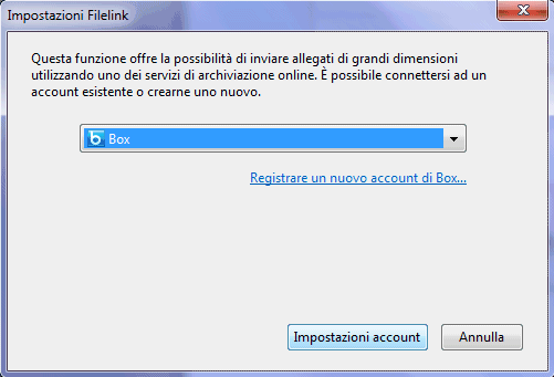 Allo stato attuale, Thunderbird supporta tre fornitori di servizi di hosting dei file “in the cloud”: Box.com, Ubuntu One e YouSendIt.