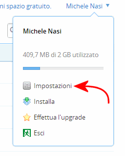 Accedendo a Dropbox via web quindi cliccando sul proprio nome utente, in alto a destra, e su Impostazioni, si potranno configurare tutte le preferenze d’utilizzo del servizio.