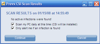 Una scansione del sistema con PrevX CSI dovrebbe essere eseguita periodicamente, con regolarità. Per venire incontro ai più “smemorati” CSI integra una funzionalità di “scheduling” che, nella configurazione predefinita, provvede ad esaminare quotidianamente il sistema in uso. Nel caso in cui non venga rilevata alcuna infezione il programma non mostra mai alcun tipo di avviso. In questo modo CSI evita di distogliere l’utente dalle attività alle quali sta lavorando mostrando un messaggio di allerta solamente nel caso in cui dovesse essere individuata un’infezione.
