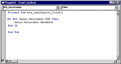 Supponiamo infatti di aver raggiunto, mediante una ripetuta esecuzione mediante dell’istruzione Data1.Recordset.MoveNext, l’ultimo record memorizzato all’interno della tabella di nostro interesse, contenuta nel database. Un’ulteriore esecuzione della stessa istruzione causerebbe un errore (nel caso di una lettura da un normale file di testo si avrebbe un errore di “lettura oltre la fine del file”). L’uso della struttura If Not Data1.Recordset.EOF Then consente di risolvere il problema permettendo l’esecuzione dell’istruzione Data1.Recordset.MoveNext solo nel caso in cui non sia stato già raggiunto l’ultimo record.